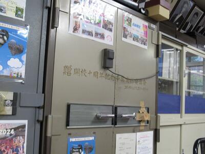 6年生たちが加わり、40年前の創立10周年記念で学校に贈られた金庫を見ています。