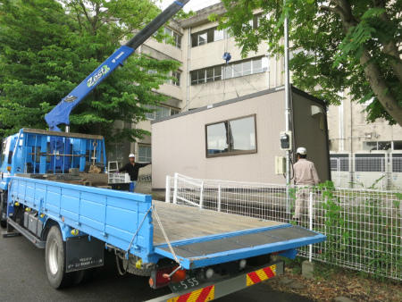 今日は、児童棟の工事に向けて、工事の事務所設置がありました。トラックで運んできた事務所がクレーンであっという間に設置されました。足場作りは7月10日から恥じまします。皆さんにご協力やご迷惑をおかけすることもありますが、きれいになった児童棟の姿を楽しみにしてください。