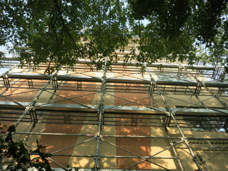 児童棟の外壁工事が順調に進んでいます。足場も表側を除き、組みあがることができました。休みに入ると、表側の足場を組み、本格的な工事に入ることになります。体育館のトイレ工事も内壁をはがし、本格的に工事が始まりました。ご迷惑をおかけすることもありますが、ご協力よろしくお願いします。