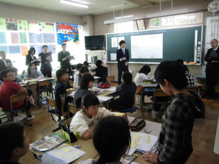 本日、5年1組で「エキスパートを目指す授業研究会」が行われました。協同的な学びを目指した社会科の授業を、市外からも多くの先生が見に来られました。子どもたちも、一生懸命思考を巡らし、海運について学びを深めました。