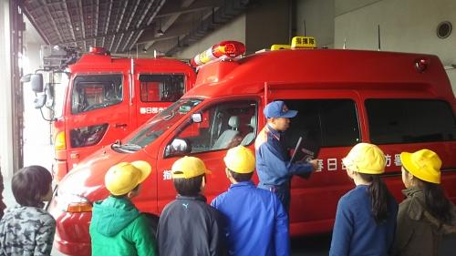 消防署見学です。まずは車両見学。写っているのは指揮車。600万円だそうです。奥にははしご車などが勢揃いです。
