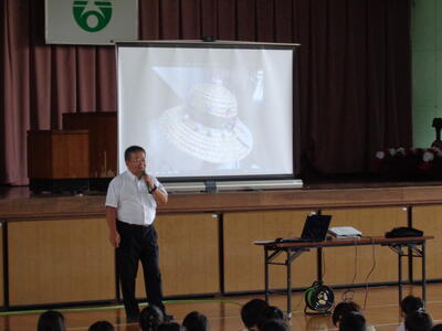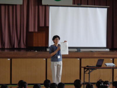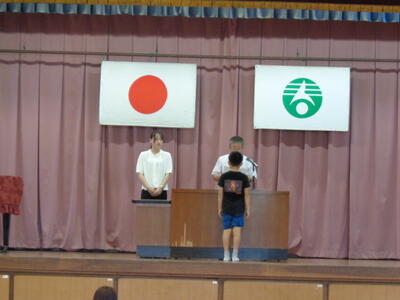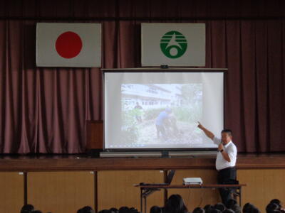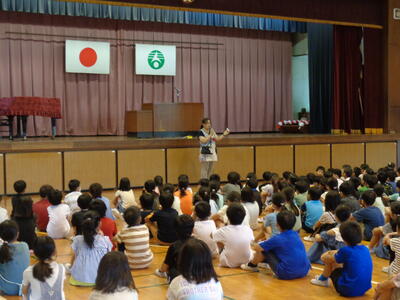 7月3日(月)朝に、体育館で7月の講話朝会が行われました。