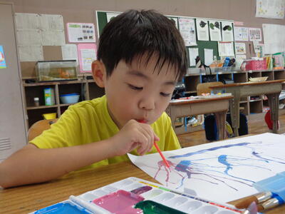 見てみると、絵の具を溶かした水を画用紙に乗せ、それをストローで勢いよく吹いていました。