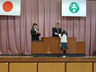 代表児童は、大きな声で返事をしてから登壇し、校長先生から賞状を授与されました。