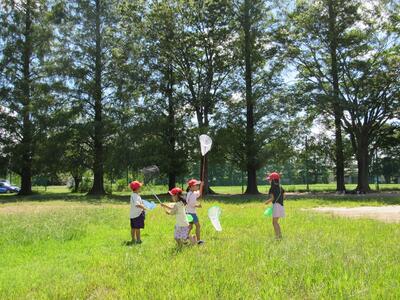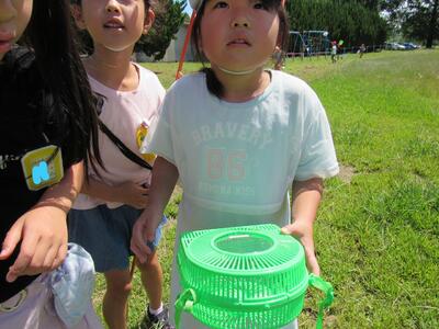 虫取りあみ、虫かごなどを持って、1年生3クラスが校庭で活動中!!