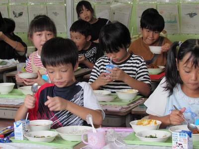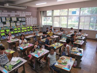 「皆さん、できる限り残さずに食べて、体を大きくしていこうね。」 「はあい。」