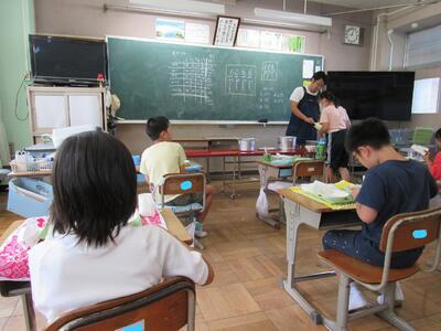 この授業の問題、予想が書かれ、観察の結果を整理した板書は、子供たちに分かりやすいです。