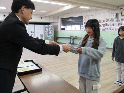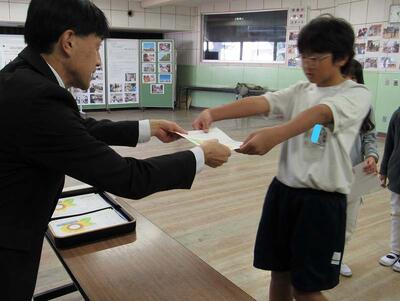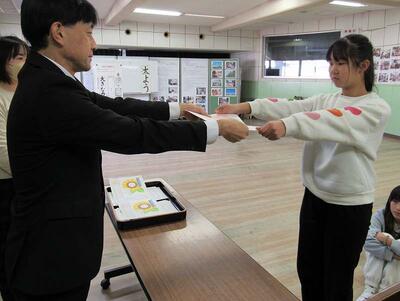 1組と2組の委員長に代表として、授与しています。
