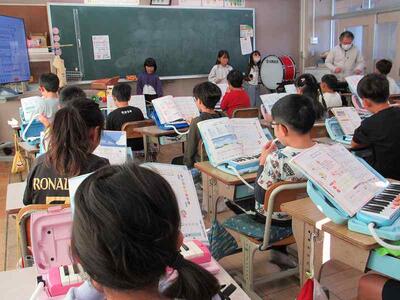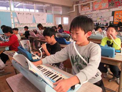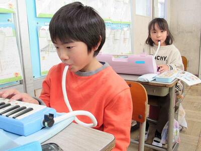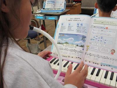 けん盤ハーモニカで、リズムをしっかりと取っています。