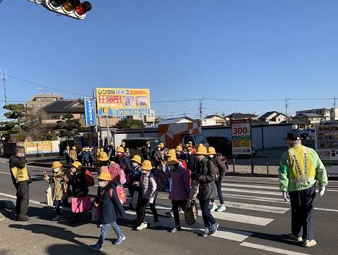 毎朝、保護者の方や地域のボランティアの方、交通指導員さん、スクールガードリーダーさんが、子どもたちに気持ちのいい挨拶を届けてくださっています。さらに校門の前では、わんわんパトロールのつくねちゃんがまってくれています。冬の装いがかわいらしいですね。