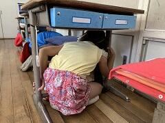 まずは第一動作「机の下にもぐりこみ、体を小さくする」です。指示がなくても緊急地震速報の音で第一動作がとれていました。地震がおさまった後は火災が起こったという想定です。第二動作の「避難」では、教室で整列した後、校庭に出る場所までの避難経路を確認しました。