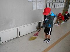 1年生は、初めての清掃ということで、6年生のお兄さんお姉さんが、ほうきの使い方を教えてくれました。