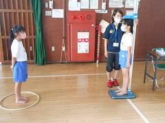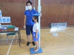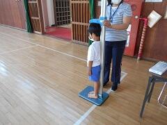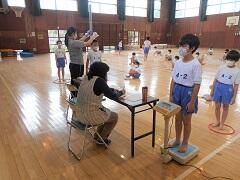 例年は4月に、保健室で行っているのですが、今年は6月に、さらに待っている間の密を避けるために体育館で行いました。身長と体重を測りましたが、この後、背の順での並び方が確認されます。