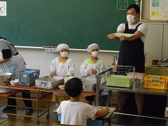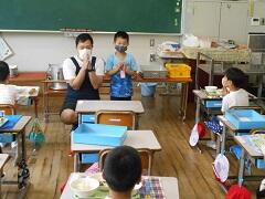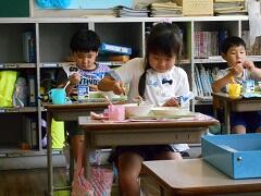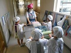 1年生は小学校生活初めての給食になります。給食室に取りに行くと、調理員さんに「よろしくお願いします。」「ありがとうございます。」のあいさつがきちんとできていました。