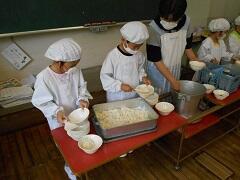 給食当番の人は、お皿やお椀の準備、盛りつけなどたくさんの仕事があります。先生方といっしょに仕事をして、少しずつ覚えていきます。自分の給食を運ぶ人も、こぼさないように慎重に運んでいます。