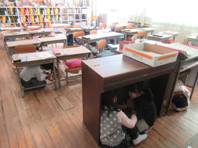 今回の訓練は、児童には事前に知らされていませんでした。それでも緊急地震速報の放送が流れると、すぐに教室の机の下に身を隠して次の放送を待つことができました。