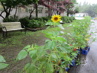 3年生が育てているひまわりが花を咲かせました。第1号です。