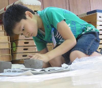 専門家の方を講師にお招きして、一通りの工程を説明してもらってから制作活動に入りました。子どもたちは粘土の固まりとの格闘を楽しんでいるようでした。焼き上がりが楽しみです。
