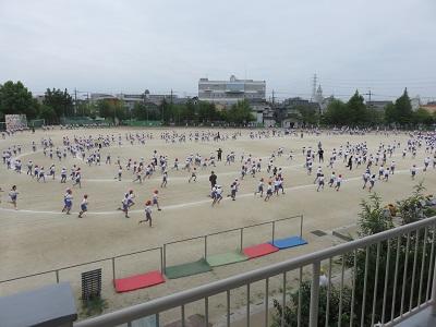 はじめに、ラジオ体操を行い、その後、校庭を走ります。暑い中ですが、八木崎っ子は、めあてをもって一生懸命走っています。