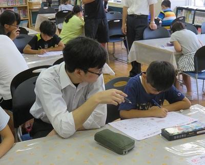 サマースクール1回目は、2年生。となりにお兄さんやお姉さん先生がいるので、学習もはかどっているようです。