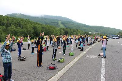 朝の集いを爽やかな朝の空気の中行いました。ラジオ体操で体をほぐしました。