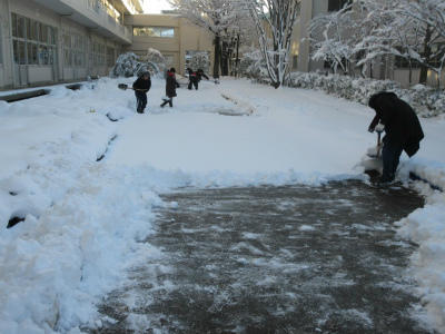 校務員さんや先生たちが、通路を作るために雪かきをしています。
