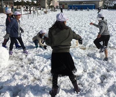 子どもたちは、3時間目に限り、校庭で雪遊びを楽しみました。このあとは、気温が上がり湿り気が出てくるので、校庭の使用は禁止にします。今は、思う存分、雪と遊んでいます。