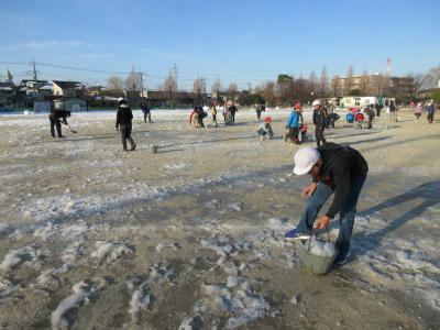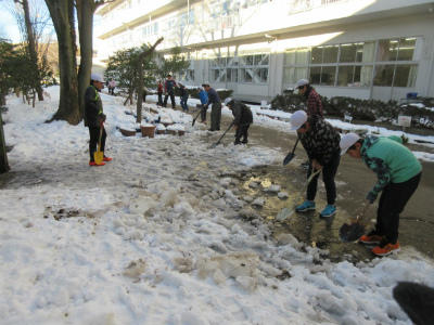 先週降った校庭の雪は少なくなってきましたが、朝になると凍結してしまいます。そこで、高学年の児童が少しずつ片付けています。