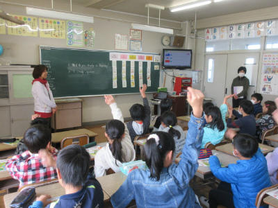 5年生の授業です。JTEの先生とともに教科を表す英単語などを学習していました。