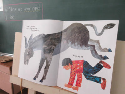 絵本の動作をまねたり、ALTの先生とチャンツをしたりしながら英語に親しんでいきます。