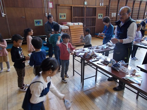 54名のふれあい大学の方に来ていただき、コマ回しや紙鉄砲、羽根つきなど、昔の遊びをたくさん教わりました。