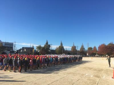少し肌寒いですが、見事な秋空の快晴のもと、今年の持久走大会が始まります。456年生の開会式です。9時出走予定です。