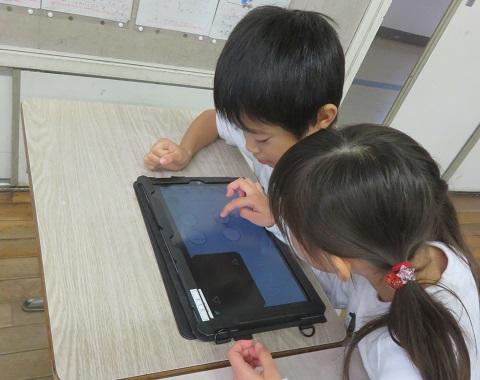 2人に1台のタブレットパソコン。指で画面に何かをしています。