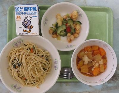 本日の献立は、ほうれんそうとベーコンのスパゲティ、揚げ大豆サラダ、フルーツ杏仁、牛乳でした。具材が細かく入っていて栄養満点のスパゲティでした。