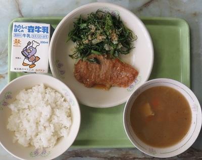 本日の献立は、ご飯、豚肉のつけ焼き、おかひじきのアーモンド和え、いなか汁、牛乳でした。今日も、おいしい給食をつくっていただき感謝です。