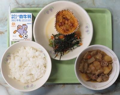 本日の給食の献立は、ご飯、肉じゃが、磯香和え、ぎせい豆腐、牛乳でした。「ぎせい豆腐」とは、ゆでてつぶした豆腐に、卵や野菜 などを加えて調味し、焼いたり蒸したりした料理のことです。今日も、おいしい給食でした。感謝。