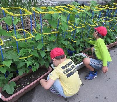 1年生は、あさがおの鉢、2年生は、自分が育てている野菜の鉢、3年生は、ホウセンカの所です。1年生が育てている朝顔は、すでに大きな花が咲き始めています。つるを上手に巻いている子もいます。一生懸命、育てています。