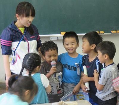 2時間目と3時間目の間の業間休みに1年生の教室をのぞいてみました。すると、おもちゃのマイクを使って「ひまわりの約束」を歌ってくれるとのこと。楽しそうに歌ってくれました。最後は、まわりのみんなで大合唱。さすが、人気アニメの歌ですね。