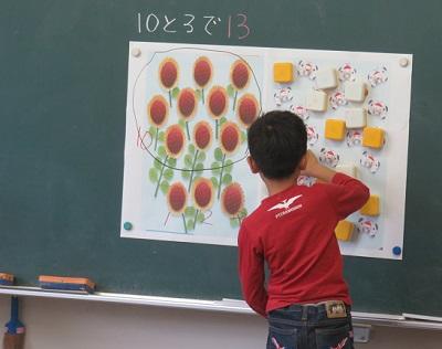 1年生の他のクラスでは、10のまとまりという考え方を学習していました。10より大きい数を数えるときに、10のまとまりをつくると数えやすいことをブロックを使いながら考えていました。