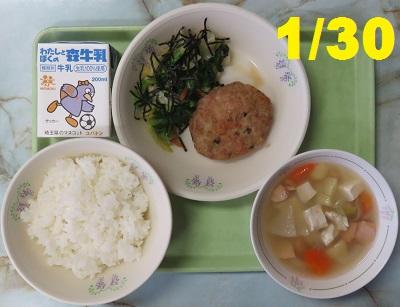 本日の献立は、ご飯、れんこんハンバーグ、磯香和え、三平汁、牛乳でした。