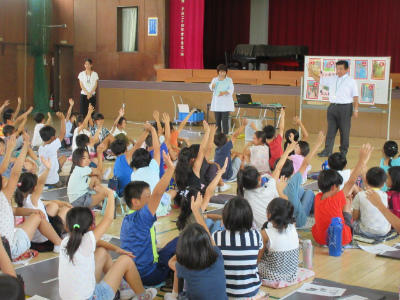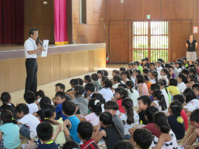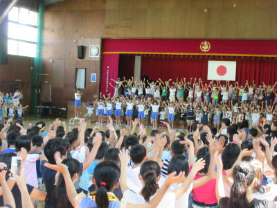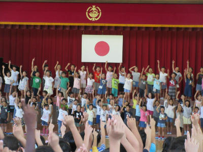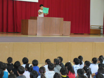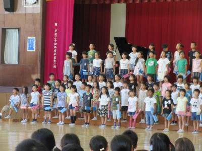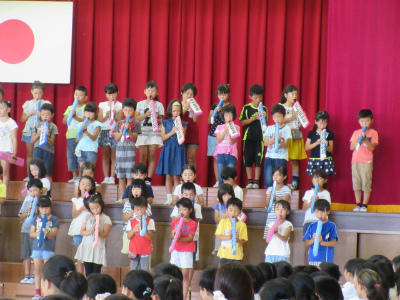1学期最後の音楽朝会。今日は2年生の発表がありました。朝から暑い日になりましたが、たくさんの保護者の方が見に来てくださいました。