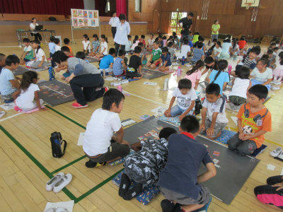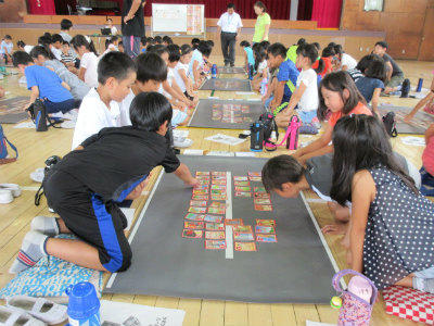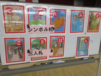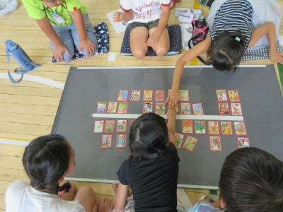 ルール説明の後、いよいよ実戦形式の練習です。複雑なルールを確認しながらも、すでに子どもたちはやる気満々。前のめりになって絵札を取り合っていました。