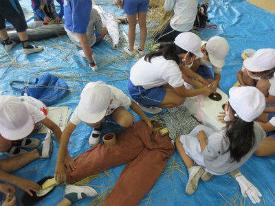 今やすっかり八木崎小学校の年中行事の一つとなった、4年生の「かかしづくり」です。
