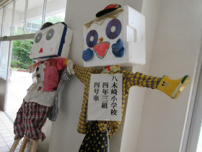 4年生が作ってくれた案山子が、5年生が田植えをしてくれた田んぼを守り始めました。また、イトーヨーカドーさんのご厚意で、今年も入口付近に展示させていただいています。ぜひ、買い物がてらご覧ください。