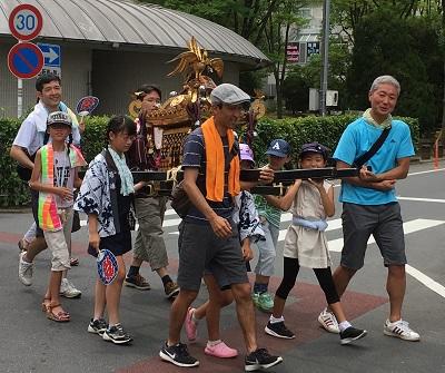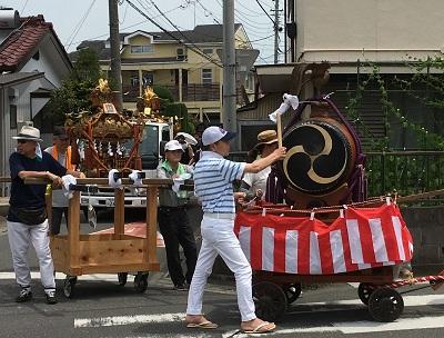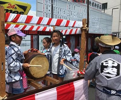 初日の今日は、中央1丁目と2丁目の子ども御輿・山車に出会いました。暑い中、あせいっぱいかきながら、御輿を担いだり、山車を曳いたり、太鼓をたたいたり・・・保護者や地域の方に見守られながら、夏まつりを楽しんでいました。
