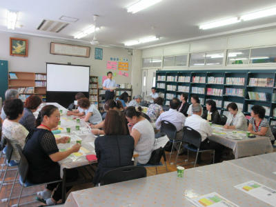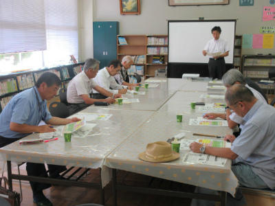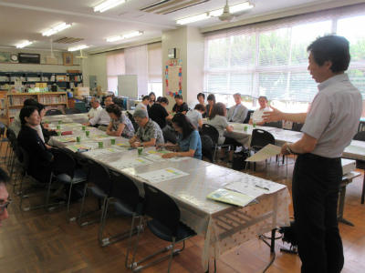 学校の概要説明、DVDによる教育活動の紹介の後、子どもを巡る様々な地域の課題について、情報交換を行いました。大変暑い中お集まりいただき、ありがとうございました。