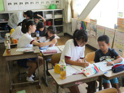 今日も8:30~サマースクールを実施しました。ボランティアの学生さんたちも大勢かけつけてくれました。参加している児童も慣れてきたようで、考えても分からない時は、ボランティアの学生さんにヒントを求めるなど、積極的に学習に取り組んでいました。