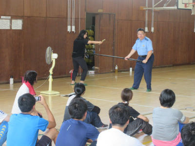 はじめは「さすまた」の使い方についての研修です。春日部警察署の方をお招きし、さすまたの効果的な使用法について教えていただきました。いきなり不審者を取り押さえるのは難しいそうです。適度な距離を保ちつつ、子どもたちを避難させます。