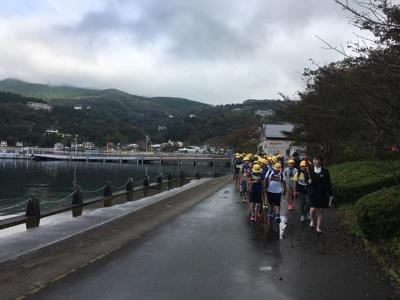 予定より少し早く小田原城へ向けて出発しました。ガイドさんが箱根八里を歌い始めたら急に霧が出てがました。