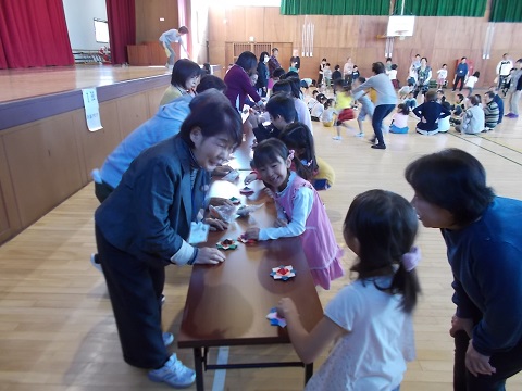 54名のふれあい大学の方に来ていただき、コマ回しや紙鉄砲、羽根つきなど、昔の遊びをたくさん教わりました。
